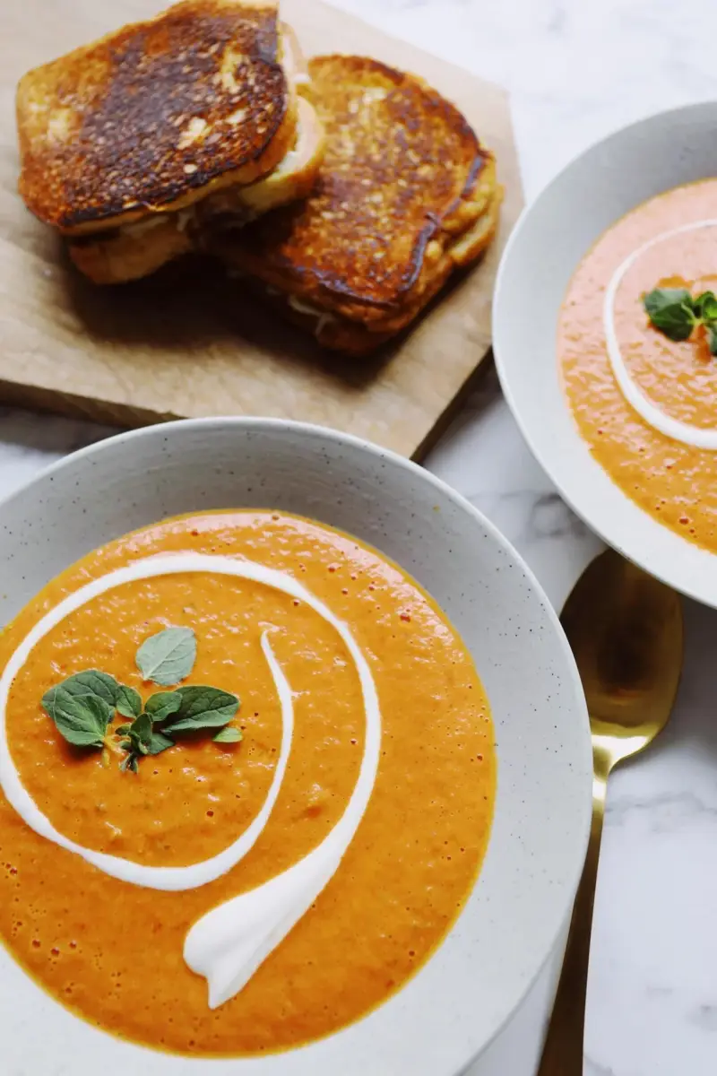 Gebakken tomatensoep met een heerlijke tosti na een super leuke herfstwandeling ? Zeker en vast. Deze heerlijke en smaakvolle tomatensoep bestaat uit gebakken tomaten, uien, paprika, knoflook en kruiden gemengd met gepelde tomaten, zelfgemaakte bouillon en pure room. Ik heb de soep geserveerd met de heerlijkste knapperige tosti's, die samen met de soep heerlijk smaken. Het broodje soep en een tosti zijn perfecte gerechten om voedselverspilling tegen te gaan. Saaie groenten kunnen makkelijk gebruikt en gedroogd worden, een dag oud brood leent zich hier uitstekend voor.