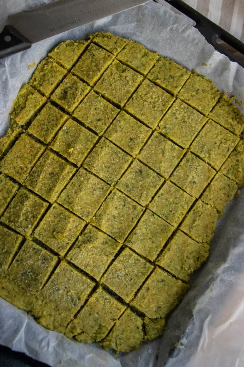 Gebruik vervolgens een scherp mes om in blokjes te snijden en over te brengen naar een diepvriesbestendige container om te bewaren.